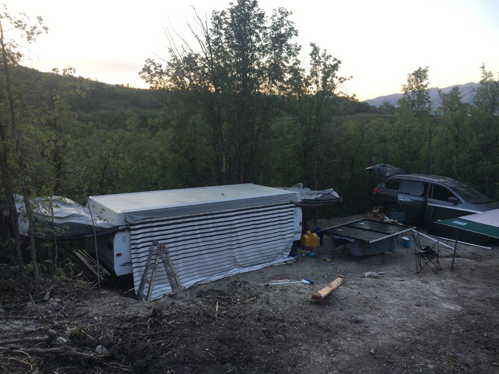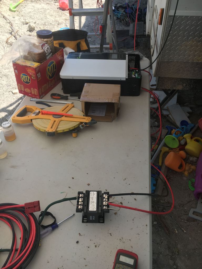 Since it was low on oil I didn’t run the excavator. Instead I played with solar! My inverter can run off of only Solar, no batteries required. It powered up right away when I hooked it up but the inverter part wouldn’t turn on. So there was only one thing to do…. I “quickly” ran home and grabbed two more solar panels. I spent a lot of time in the car! I hooked a 5th panel up and ….. viola! I had AC power. And it ran the microwave no problem. That was super fun! Then I ruined my day by trying to change my mounting strategy so that I could fit all 5 panels up on the top of the trailer. It can fit.. but getting it mounted will be tough. Also trying to move two panels at the same time by myself was a solid workout! In the end when the sun went down I had to give up (which was probably a good thing to save me from myself :p ) So… I still need to finish out my solar. But it was super cool that I got some AC power out there! Hopefully next week is a good weekend. It will be our long weekend and the weather looks to not be too insufferable! Should be a great weekend for a campout!