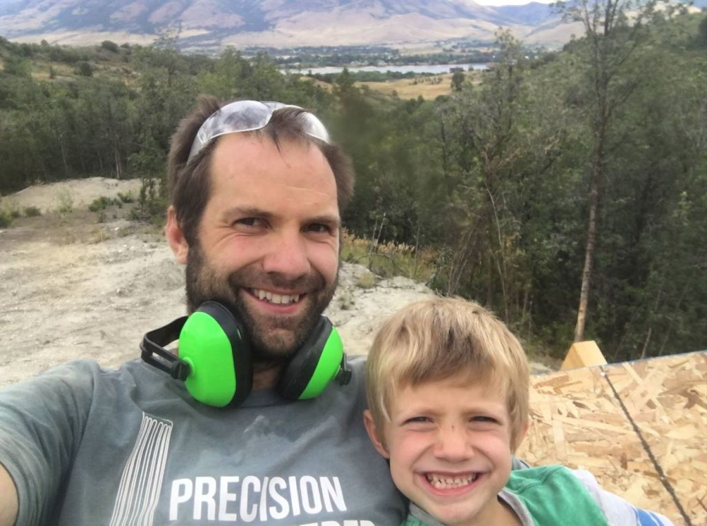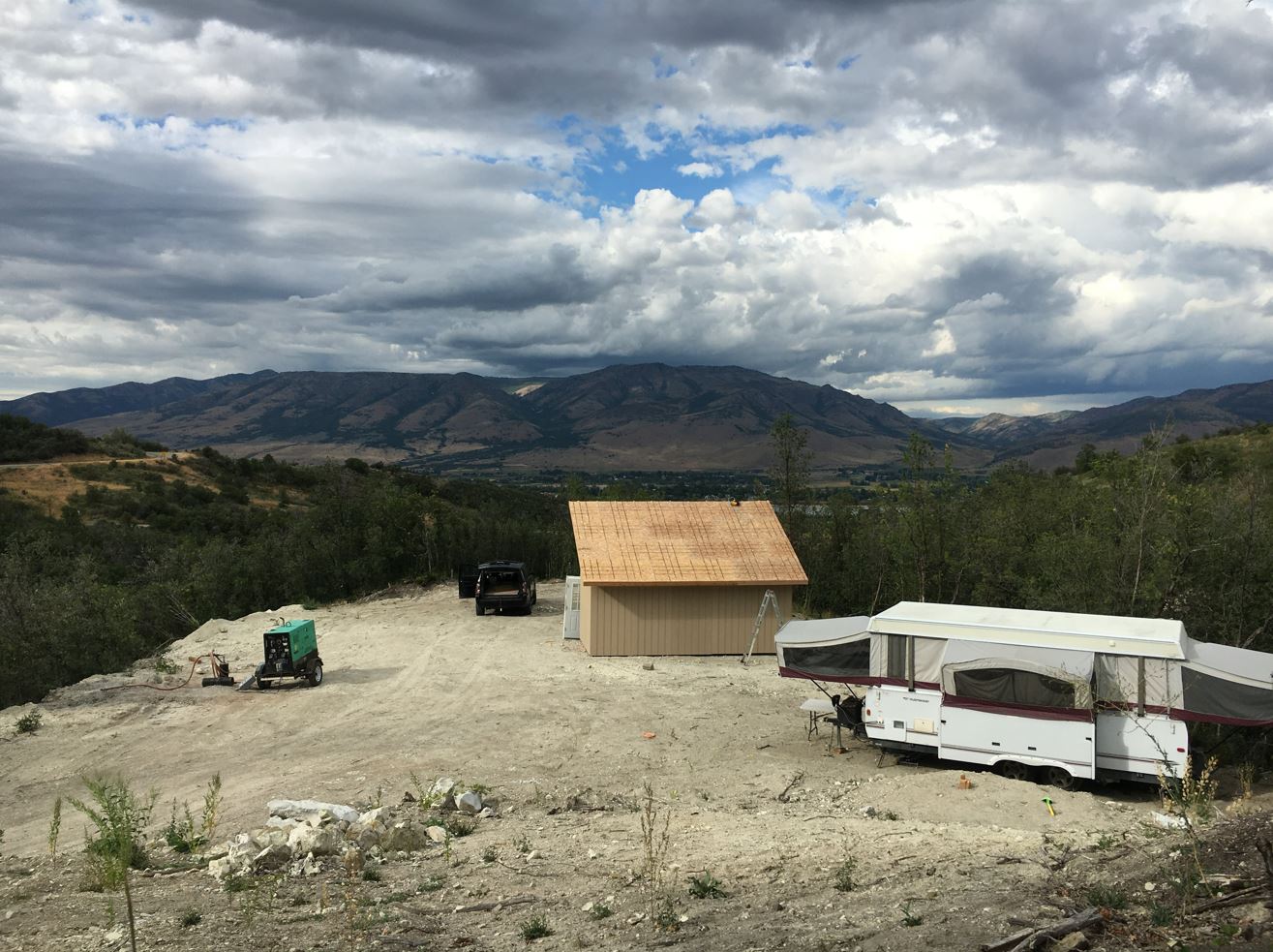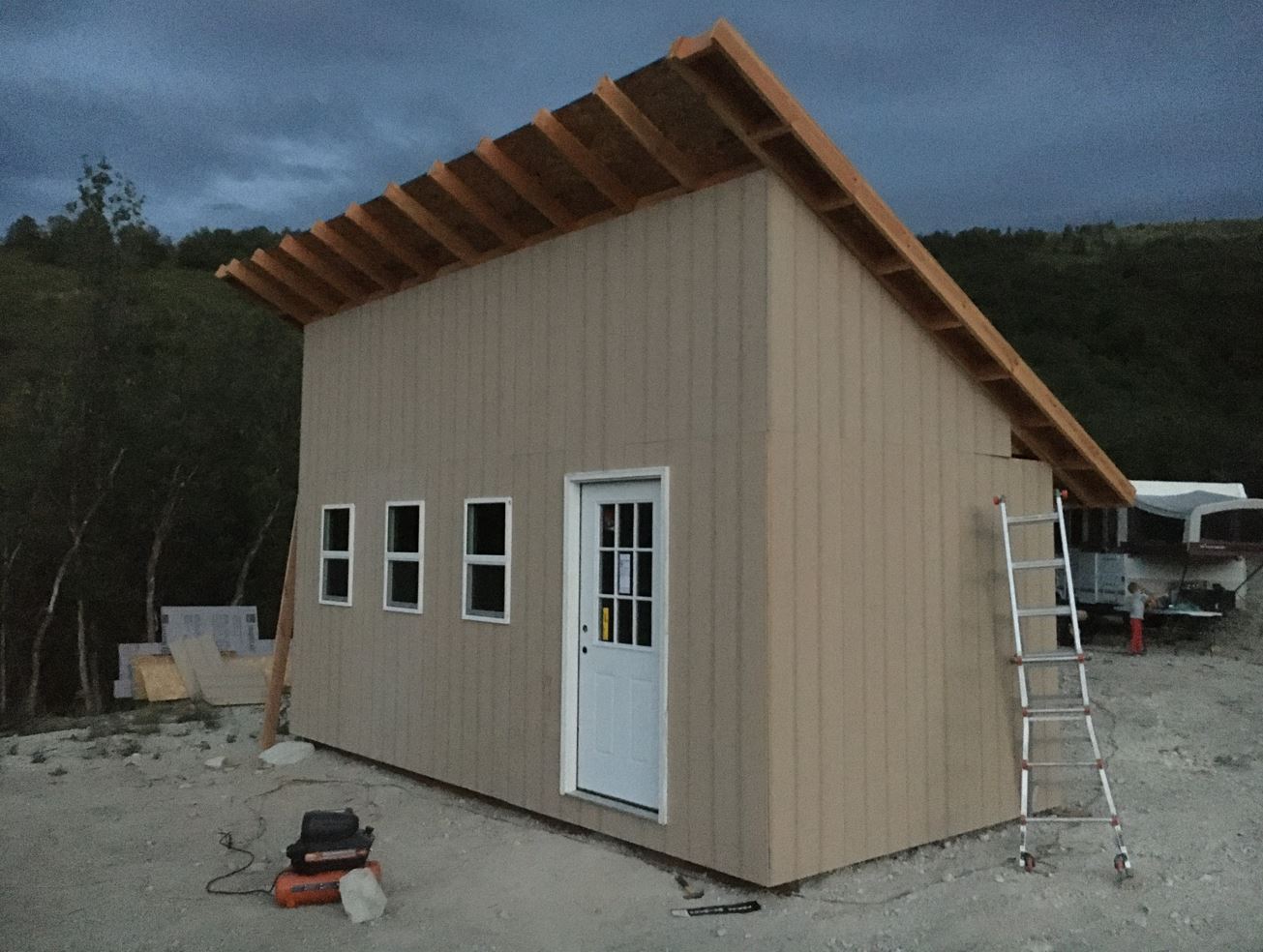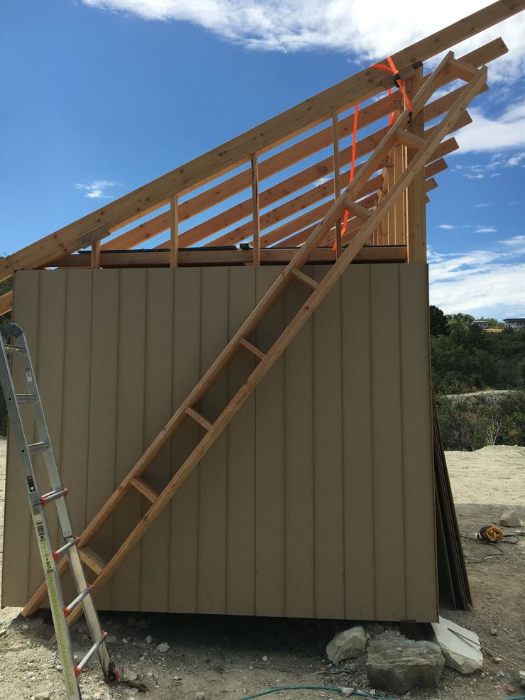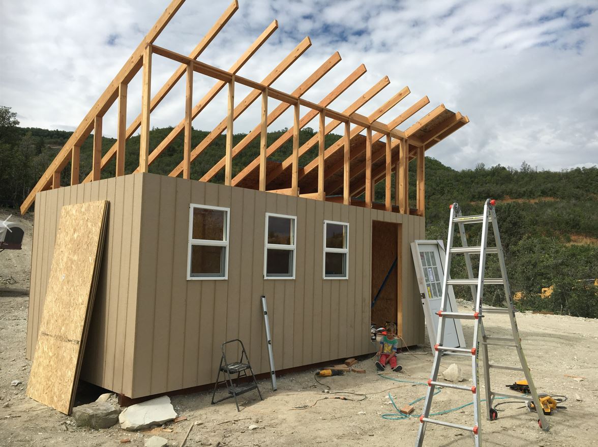 - And then there is the shed. I was out back-packing with the Youth last week out on an awesome trail in the wind rivers Wyoming mountain range. I got home Friday and after a short night in my bed, I woke Andrew up at 5:30a.m. Saturday morning and we ran out to the land and didn’t leave till it got dark! Andrew was a trooper and was a good little gopher for me 🙂 .. I did have a bit of a challenge trying to get the other “ladder” up on the roof for the other eave by myself. Luckily with a ratchet strap I was able to hold it in place and get it installed. It was a bit of a song and a dance while standing on one foot with my tongue sticking out kind of a deal while sweating in the blistering heat 🙂 Either way, I got the roof OSB all installed, and the windows and door and a majority of the siding done. I am hoping to get the shingles on and the roof water tight this weekend so it will be ready for some solar panels!