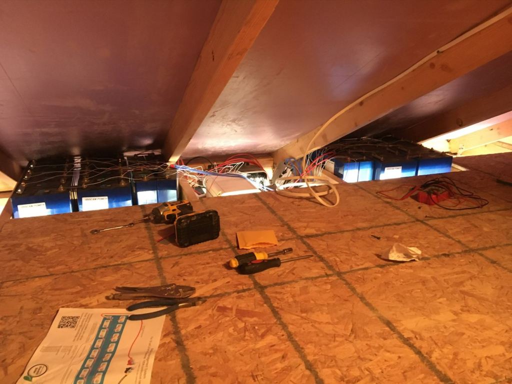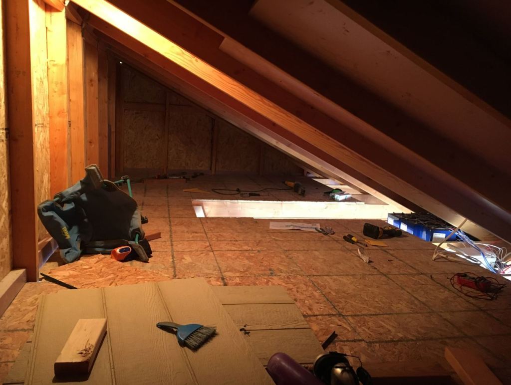 With a broken excavator I spent all of Saturday working on the shed. We got a little more rain that morning so we were a bit cooped up in the shed. Luckily though I got the loft done and was able to throw up a temporary light up there. The kids love playing up there so that helped a lot. Except for with James. He gets into everything all the time. He kept me and Lydia on our toes. But I did get the second bank of batteries hooked up and ready to go. Very excited about that. And I have a lot more of the insulation in. See Pics 11-14 I think I have only 6 sheets left to cut up. (out of like 30?). So I am getting close!