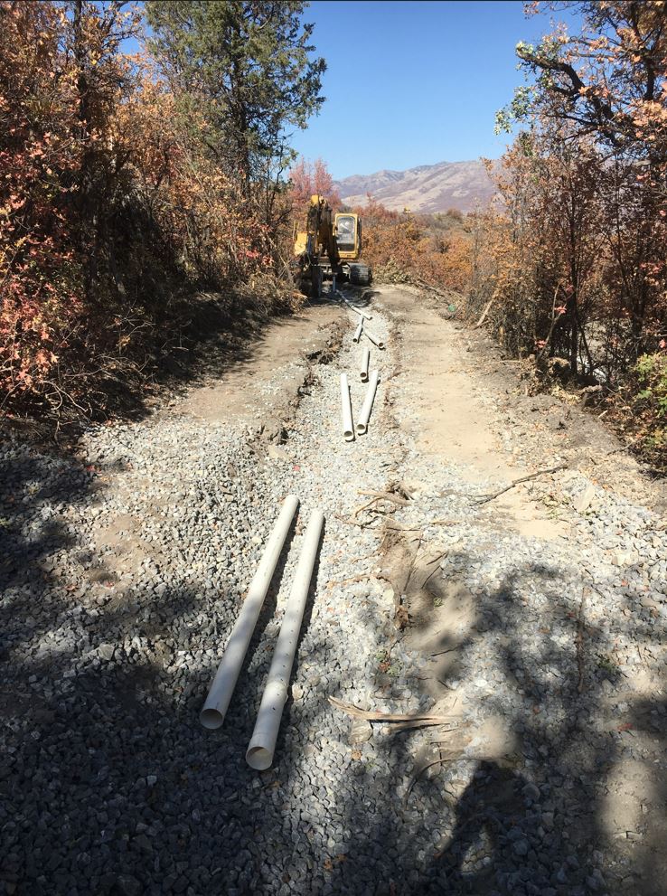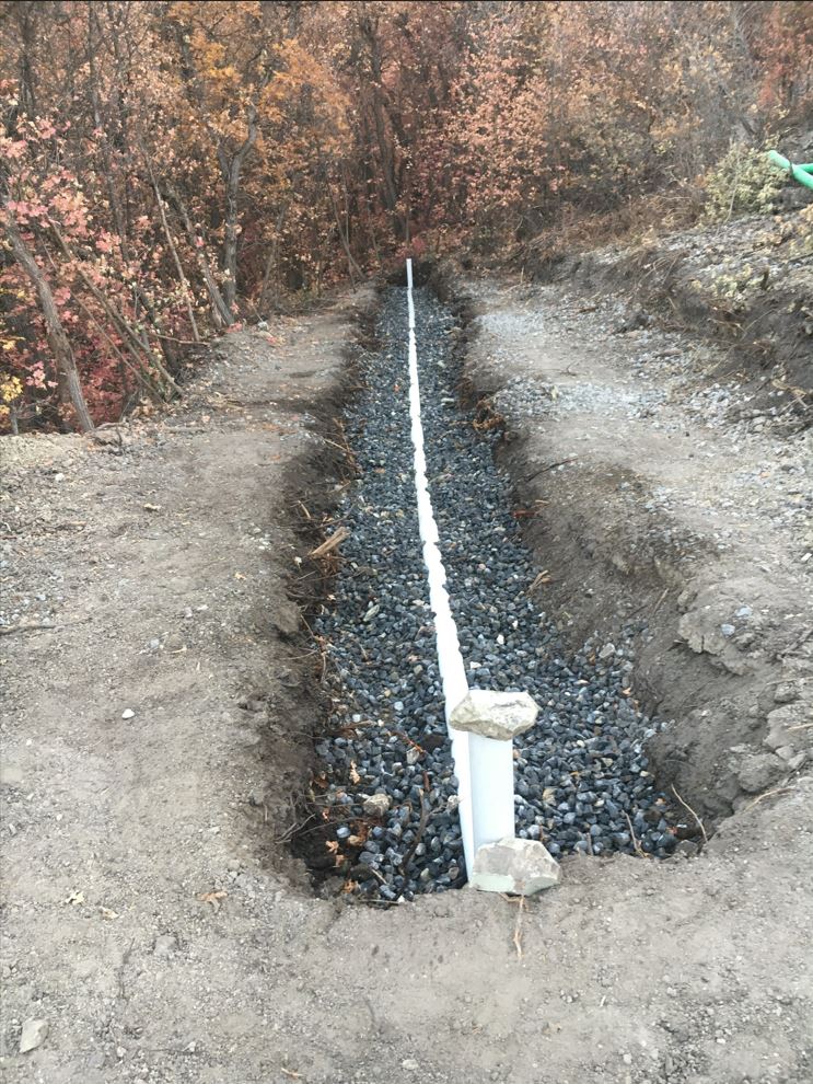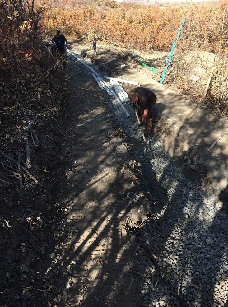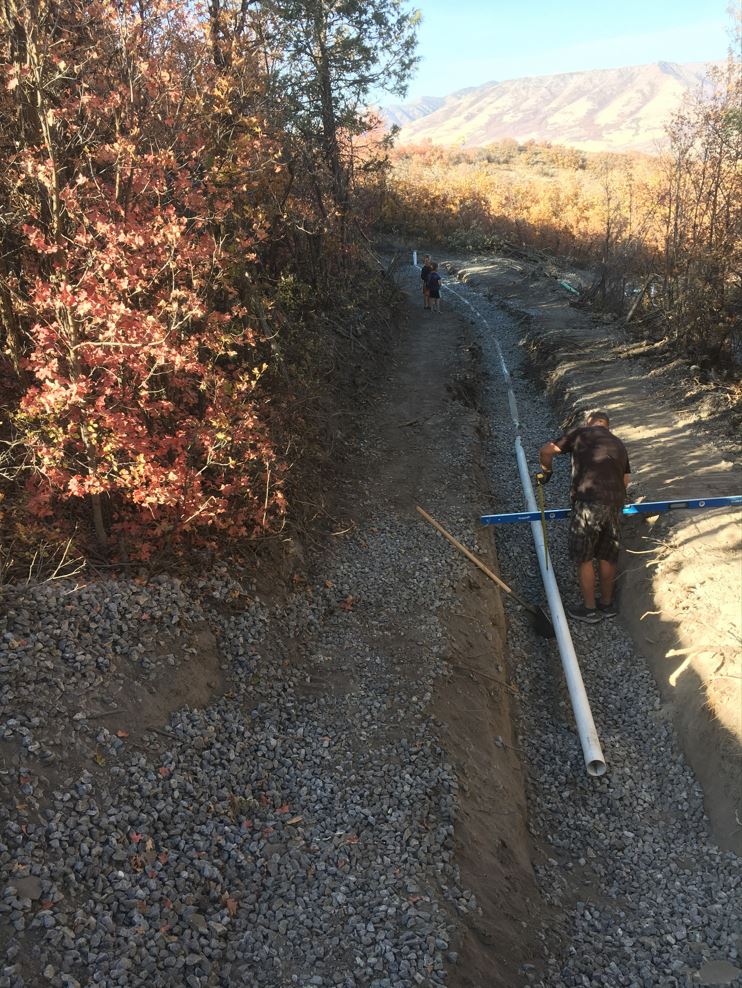 Karianne was off at a quilt retreat this weekend, so my step mom and very recently retired dad came out to Utah to help with the kiddos. And what a blessing that was. As the weather was about to turn I also found myself mildly under the weather. I tried to put on a good game face (with the help of some IBuprofen) and went up to the land on Friday with my Dad. It was the last perfect day of weather. And we were able to knock out the distribution pipe installation! But it was pretty miserable work. The pipes had to be super level and in order to do that it required manipulating that 1.5″ gravel by hand. And that gavel does not move by hand! Shovels, rakes, hands, feet, etc. it just doesn’t move very well. The excavator makes it look so easy.. but by hand .. not so much. It took us about 5 hours to knock it out but we got it done. I never could have gotten it done without my dad!