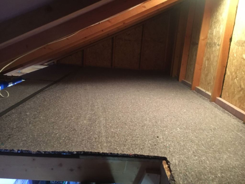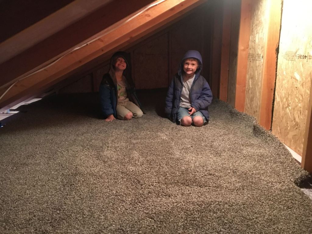 I didn’t know what needed to be done next but my designer said he’d come up Friday after lunch to line me out. So Samuel, Andrew and I got up early Friday morning, stopped at a few stores and made our way out to the land. Since I didn’t know what needed to be done with the leach field I started finishing up the insulation in the shed. But before that.. in an attempt to make the shed a bit more fun for the kids… I put some carpet in the loft!
