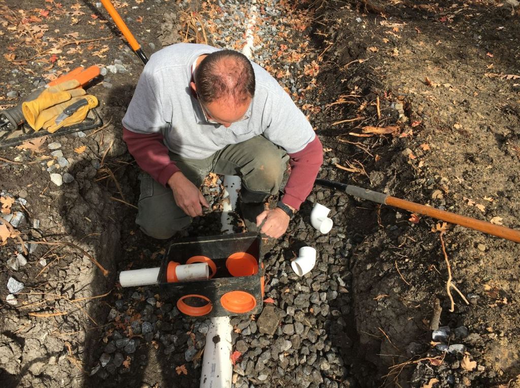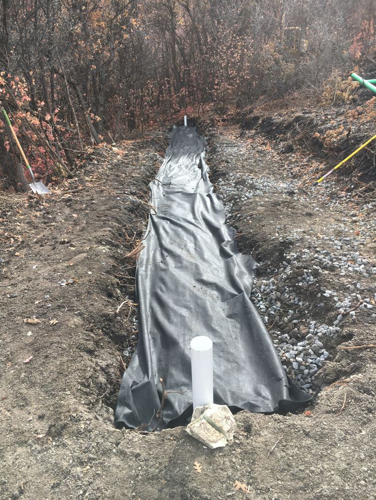 Saturday, my septic guy finally showed up around 11:30. He helped me install the distribution box and told me how to bury the pipe; 2″ of gravel on top followed by 4 oz fabric followed by dirt. Luckily, that all went relatively fast! And I was happy to bury all that miserable gravel! It is not easy to move around… not sure if I mentioned that yet 🙂 I still need to make the connection from the distribution box, which is in the upper trench, down to the lower trench. But that can wait till next spring.