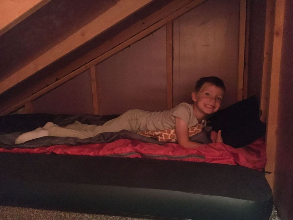 Andrew and I were planning on staying the night in the shed for the first time.. and we didn’t want to freeze. And stay the night we did! It was fun, I have never seen a kid so excited to go to bed.