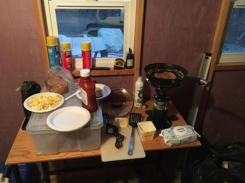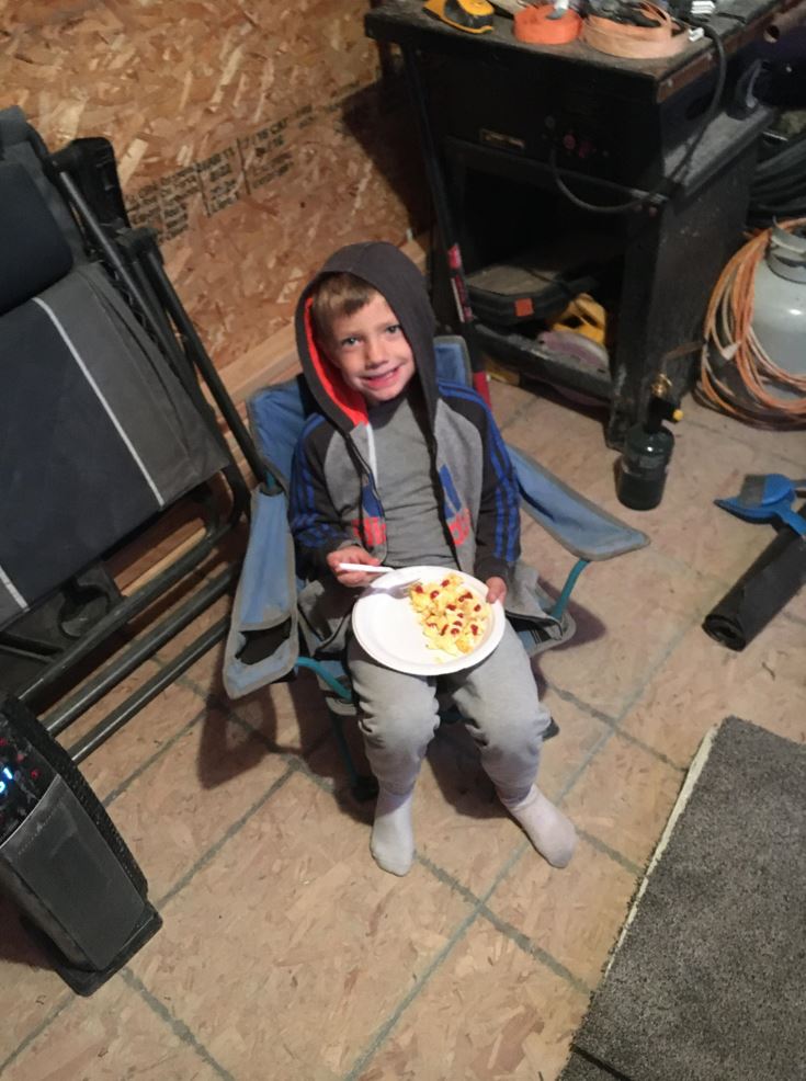With a small electric heater the shed was a very comfortable 60+ degrees all night! Karianne and the balance of the kiddos came up to see the progress and took Samuel home that night. Saturday morning brought our first attempt at cooking in the shed. It was all pretty fun. I am ready to move in! 🙂