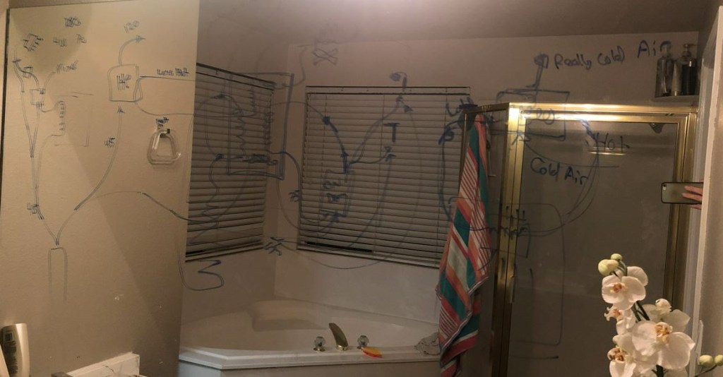 In the last letter, I also mentioned the Manual J – or thermal analysis of the house. I am pleased to have that completed as well. This one is actually really boring on the surface, but it is one of the most critical pieces of paperwork I need in order to build an off-grid house. I have been discussing at length with Karianne and also with her brother Doug about how to design the HVAC system. One night… Karianne and I hashed it out on our bathroom mirror. All good times!