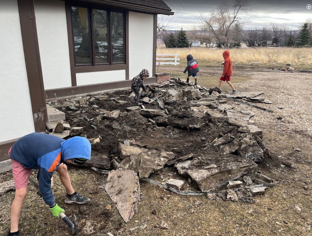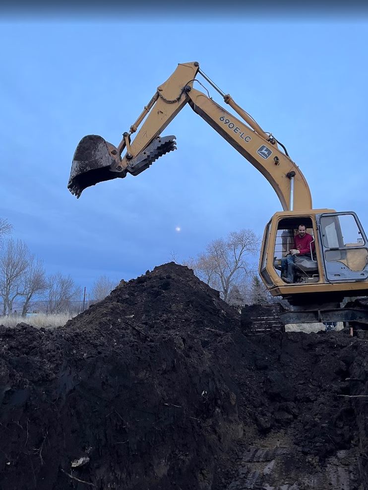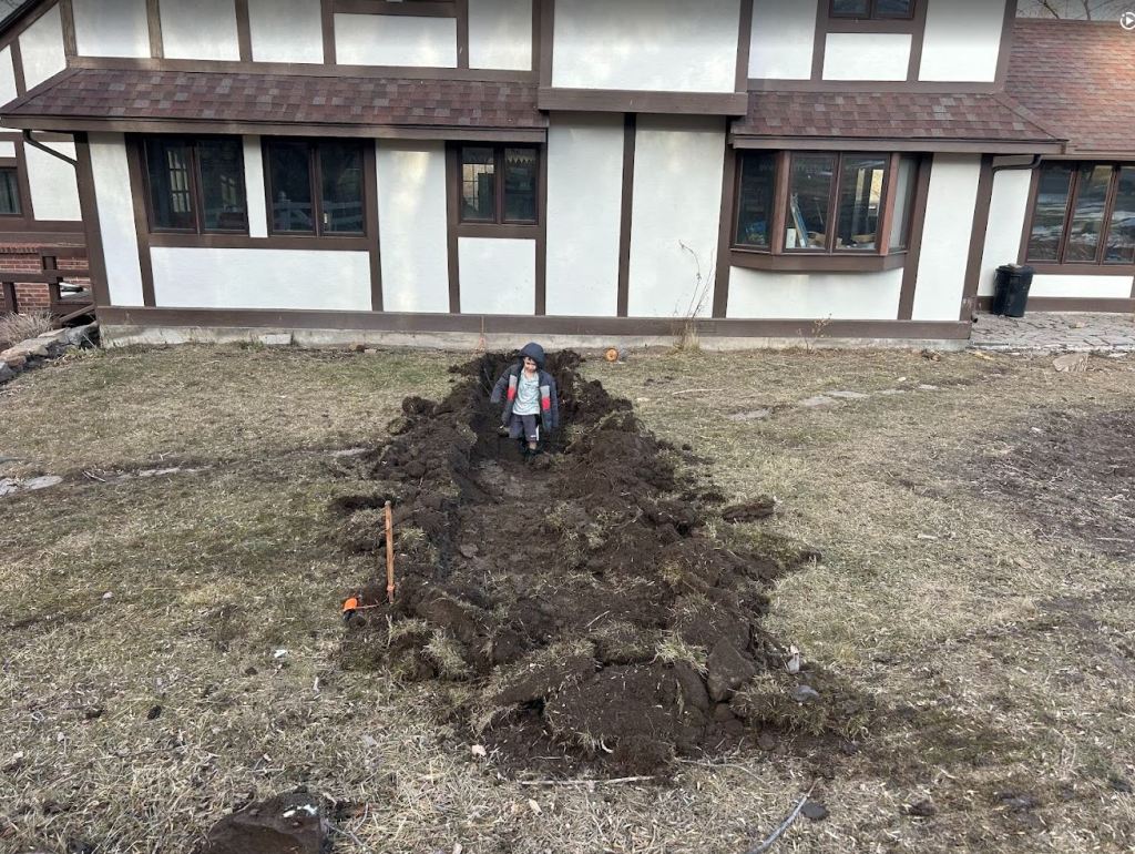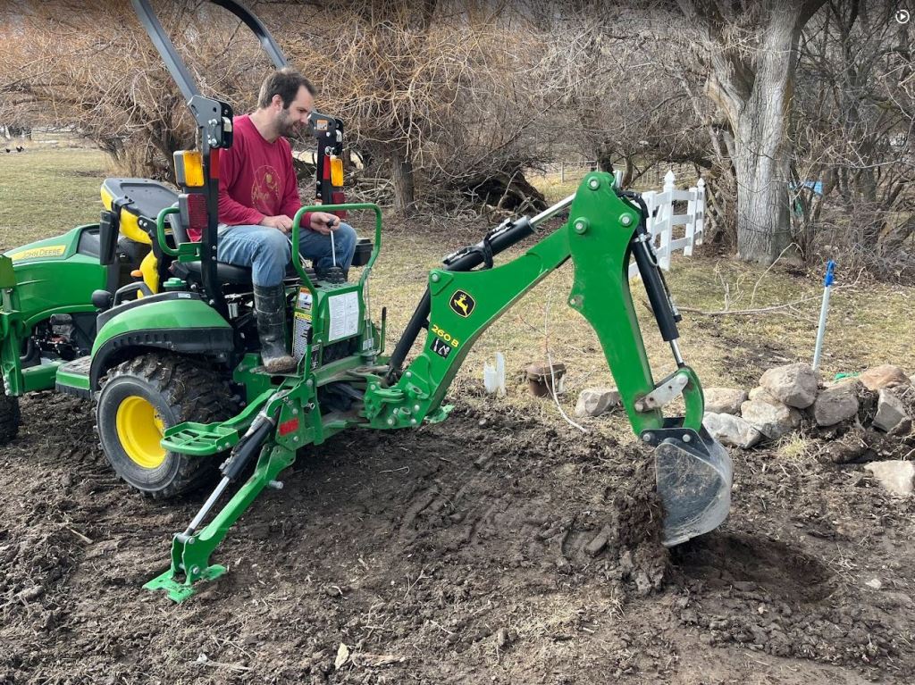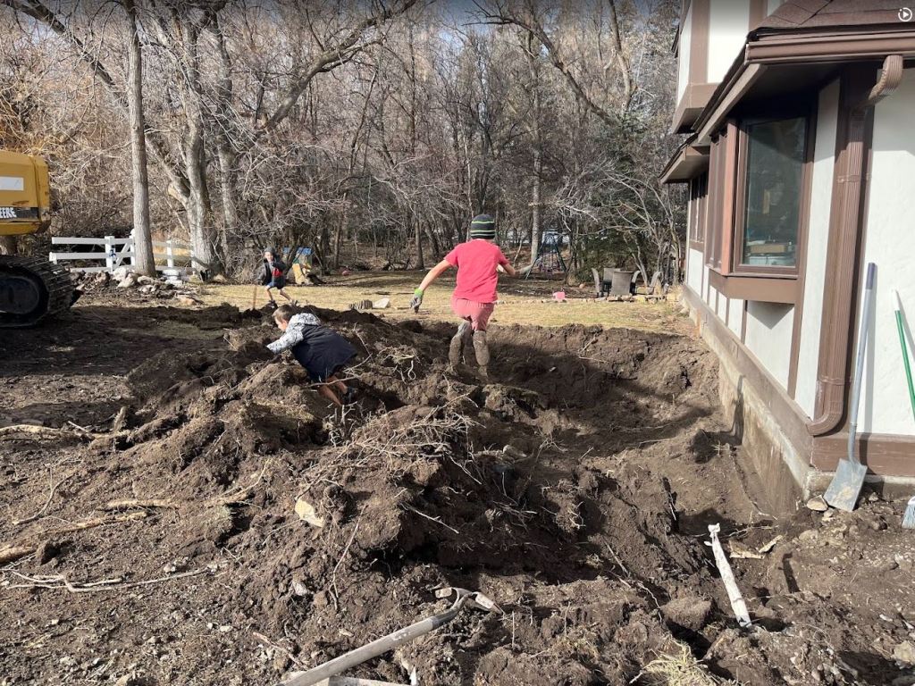 The dig was not totally without incident. Yesterday we lost a good 2 hours of time when I ripped up the waterline. I knew where the main water line from the well runs to the house. But this was an old abandoned auxiliary line they had run out to a spigot in the yard. I guess they decided to cap it off years ago. We tried to cap the line right where I discovered and broke the pipe but it still didn’t hold pressure. Which meant I also broke the pipe back along the way somewhere. Luckily I have an awesome neighbor that had the fittings I needed, and let me borrow his tiny john deere combo tractor so I could find the pipe way closer to the well. After finally finding it and capping it we were good. Which was a good thing because you can’t do life these days without running water. It would have been hard to go to church with our boys all covered in mud 🙂