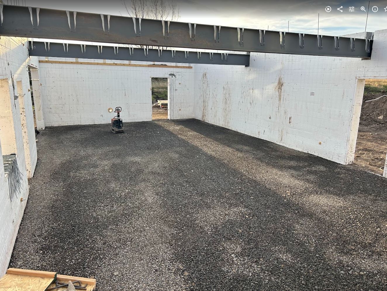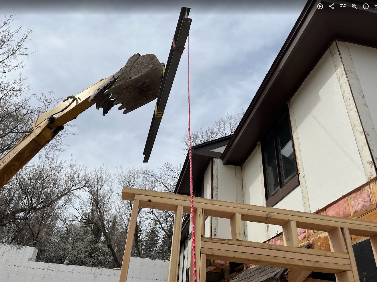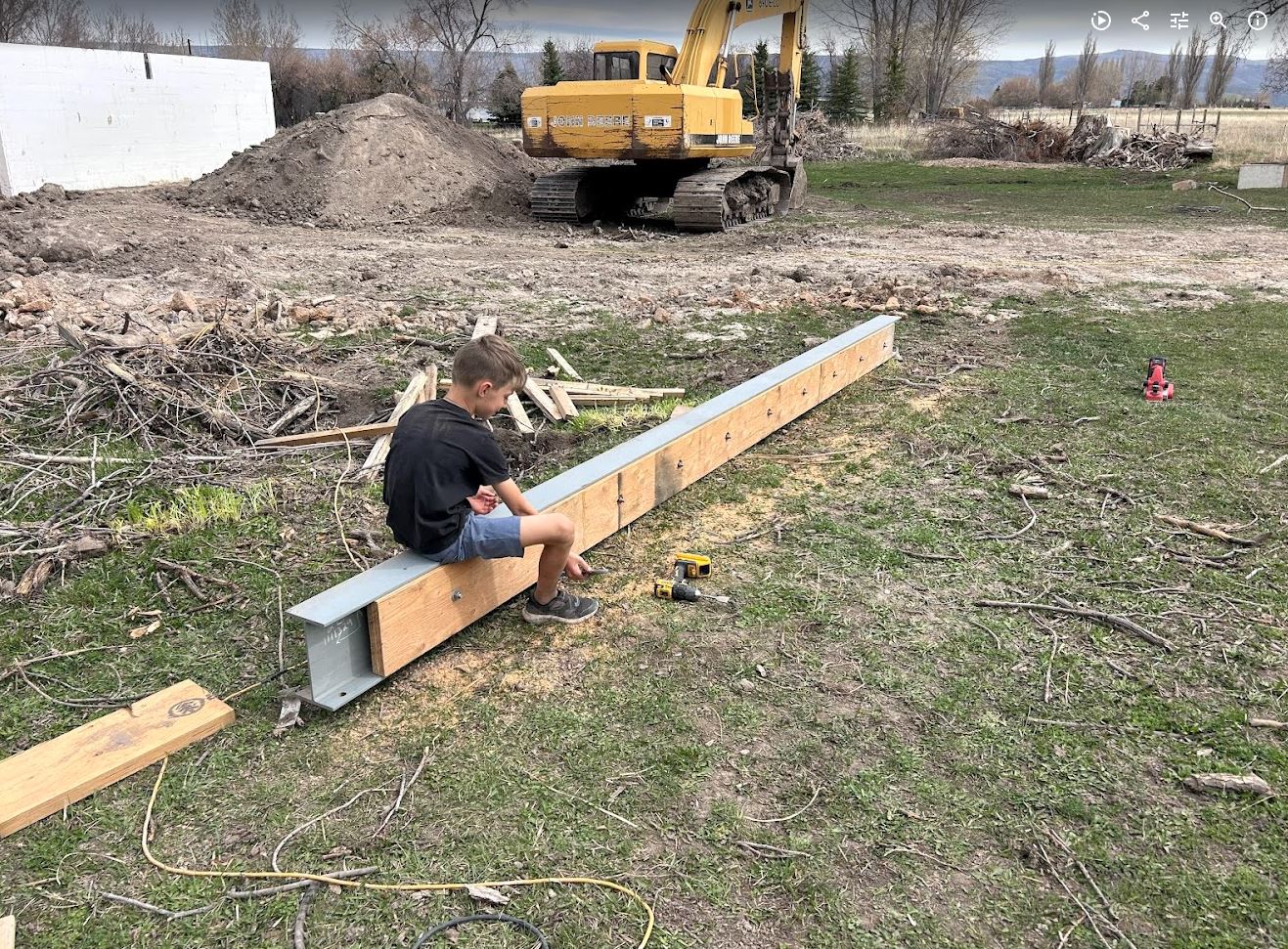 After that we had to prep the steel beam by bolting an LVL to the side of the beam (the LVL was just a hair to tall but no worries, Mark has a planer which made it easy to take 1/4″ off so it would fit in nice and snug). The LVL will be used to hold up the existing floor joists in the original house with face mount hangers. And then we had to place the beam. This took much longer than I wanted but the excavator couldn’t exactly reach where it needed to go. So we got it close and did some old fashion adjusting with some wood studs and some persuasion from our sledge hammer. It worked pretty well all things considering. Its kind of a tense operation, I have to operate the excavator and fly basically totally blind with the ICF walls in the way. So with our airpods in Karianne guides me in over the phone. Its a great exercise in communication between spouses