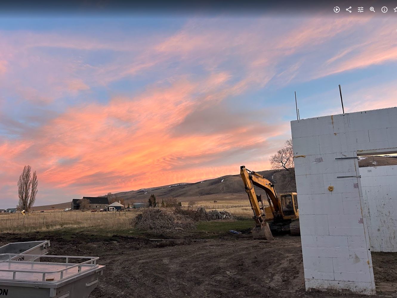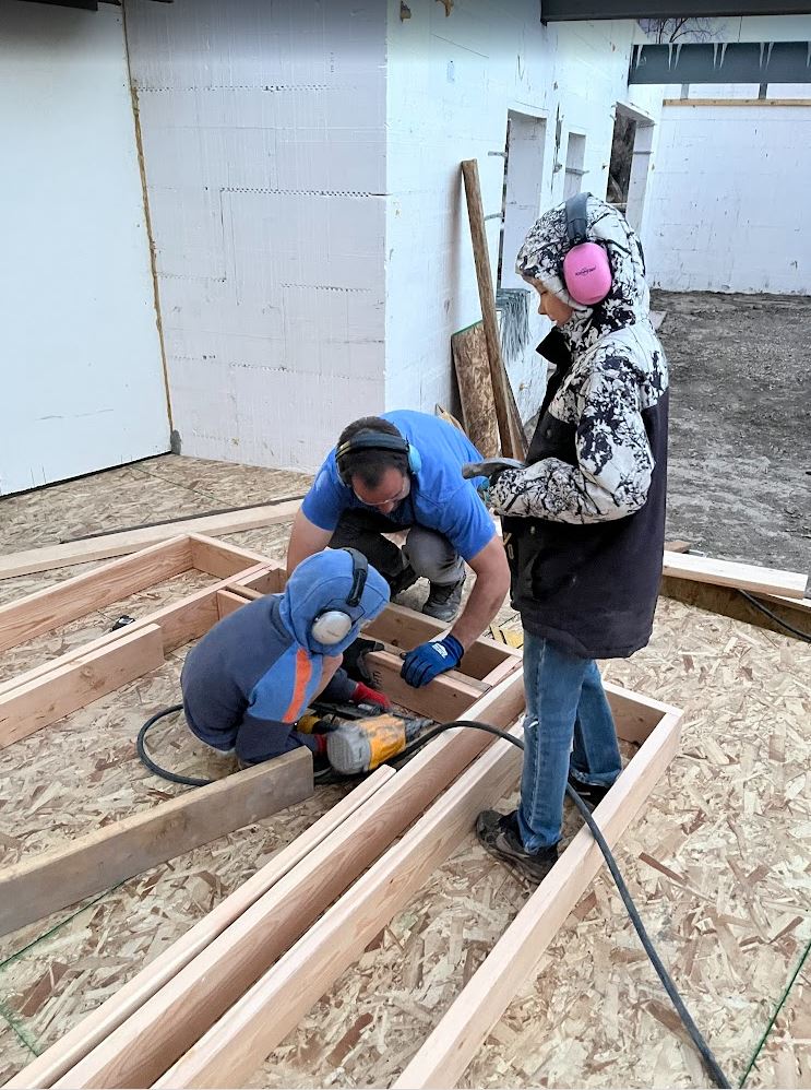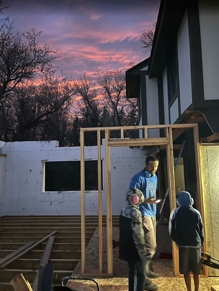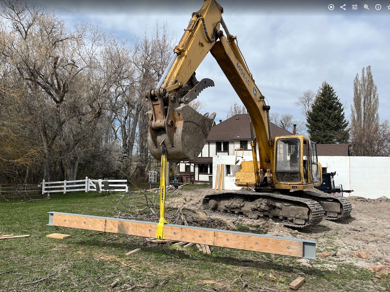 After that we had to prep the steel beam by bolting an LVL to the side of the beam (the LVL was just a hair to tall but no worries, Mark has a planer which made it easy to take 1/4″ off so it would fit in nice and snug). The LVL will be used to hold up the existing floor joists in the original house with face mount hangers. And then we had to place the beam. This took much longer than I wanted but the excavator couldn’t exactly reach where it needed to go. So we got it close and did some old fashion adjusting with some wood studs and some persuasion from our sledge hammer. It worked pretty well all things considering. Its kind of a tense operation, I have to operate the excavator and fly basically totally blind with the ICF walls in the way. So with our airpods in Karianne guides me in over the phone. Its a great exercise in communication between spouses