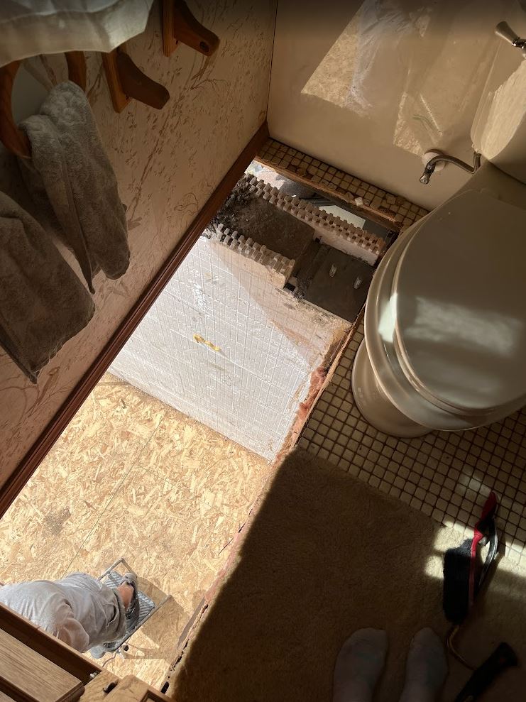 After the beam was in time was running short but we got the hangers up quickly and then installed the first five joists for the second floor! And with that we put down a piece of OSB and then filled the gap with insulation. And with that we met our goal! The bathroom was still operational and mostly “sealed” off. It was a lot of work, and I can’t believe we got it all done.